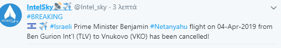 Η πτήση του Πρωθυπουργού του Ισραήλ Benjamin Netanyahu της 4/4/2019 από το Διεθνές Αεροδρόμιο Ben Gurion προς Vnukovo στη Μόσχα ακυρώθηκε! O Πρωθυπουργός του Ισραήλ είχε προγραμματίσει επίσκεψη στη Μόσχα και συνάντηση με Πούτιν….