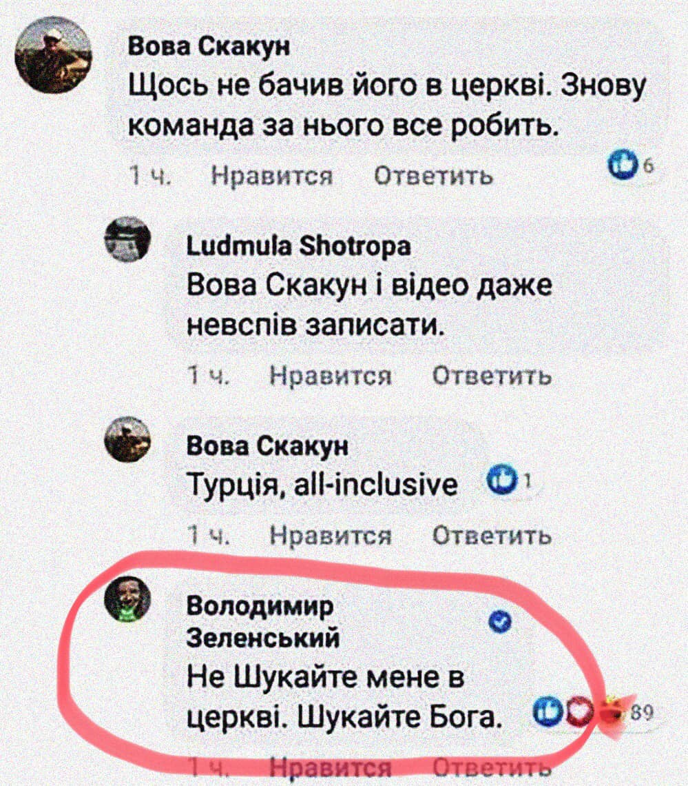 “Μη κοιτάς να με βρεις στην εκκλησία. Ψάξε για τον Θεό! ” έγραψε ο Zelensky στο Facebook.