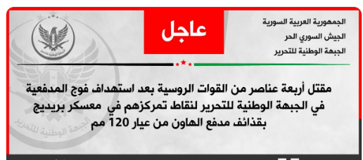 Οι τρομοκράτες της φράξιας Εθνικό Απελευθερωτικό Μέτωπο (FNL) της αυτοαποκαλούμενης συριακής αντιπολίτευσης ισχυρίζεται σε ανακοινωθέν της πως σκότωσε με οβίδες 120 χιλ 4 Ρώσους στρατιώτες στο νότο του Ιντλίμπ στο στρατόπεδο στοBraideej.