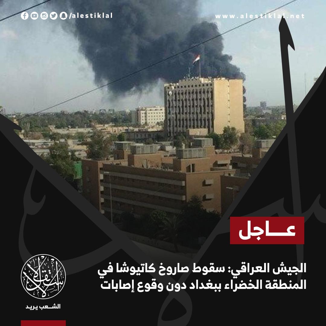 - Aραβόφωνα μέσα αναφέρουν πως πύραυλοι έπληξαν την περίμετρο της αμερικάνικης βάσης στην Πράσινη Ζώνη στη Βαγδάτη στο Ιράκ.Δεν υπάρχουν θύματα. Μάρτυρες αναφέρουν πως ακούστηκε έκρηξη από την περιοχή της πρεσβείας. H Iρακινή τηλεόραση μεταφέρει πως ο ιρακινός στρατός ανακοινώνει την πτώση μιας ρουκέτας Katyusha στην πράσινη Ζώνη χωρίς να υπάρξουν θύματα.Σειρήνες ήχησαν στην περιοχή της πρεσβείας. Ο Ιρακινός αξιωματούχος ασφαλείας στρατηγός Jalil al-Rubaie δήλωσε πως εντοπίστηκε ο εκτοξευτής πυραύλων που στόχευε την Πράσινη Ζώνη στα ανατολικά της περιοχής του καναλιού νότια της πρωτεύουσας μπροστά από Πανεπιστήμιο Τεχνολογίας. dimpenews.com