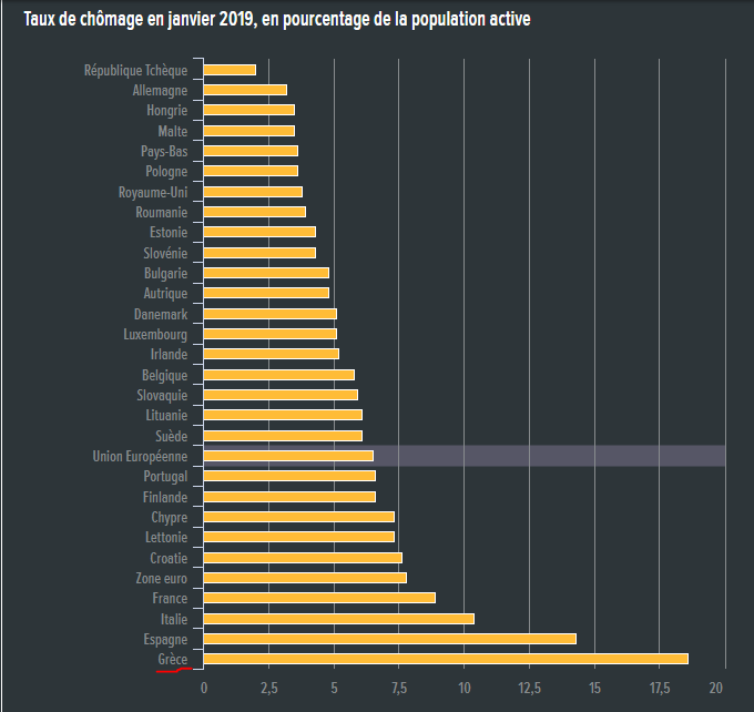H Eλλάδα πρωταθλήτρια Ευρώπης στην ανεργία το 2019 με ποσοστό 20,9%. Η Ελλάδα πρωταθλήτρια στην υποαπασχόληση (υποχρησιμοποίηση) του εργατικού δυναμικού στην Ευρώπη με ποσοστό 30%. alternatives-economiques 20/5/19