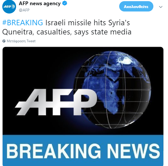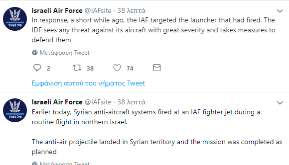 - ”Nωρίς σήμερα αντιαεροπορικά συριακά συστήματα έβαλαν κατά ενός ισραηλινού μαχητικού κατά τη διάρκεια μιας πτήσης ρουτίνας στο βορρά Israel (σσ. εννοεί κατεχόμενο συριακό Γκολάν) .