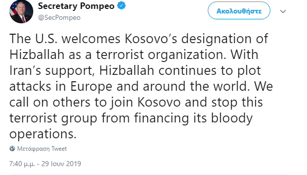 ” Οι ΗΠΑ καλωσορίζουν τον ορισμό από το Kosovo της Hizballah ως μιας τρομοκρατικής οργάνωσης. Με την υποστήριξη του Ιράν, η Hizballah συνεχίζει το σχεδιασμό επιθέσεων στην Ευρώπη και ανά τον κόσμο. Καλούμε άλλους να προστεθούν στο Kosovo και να σταματήσουν αυτό το τρομοκρατικό group από χρηματοδότηση στις αιματηρές του επιχειρήσεις.”