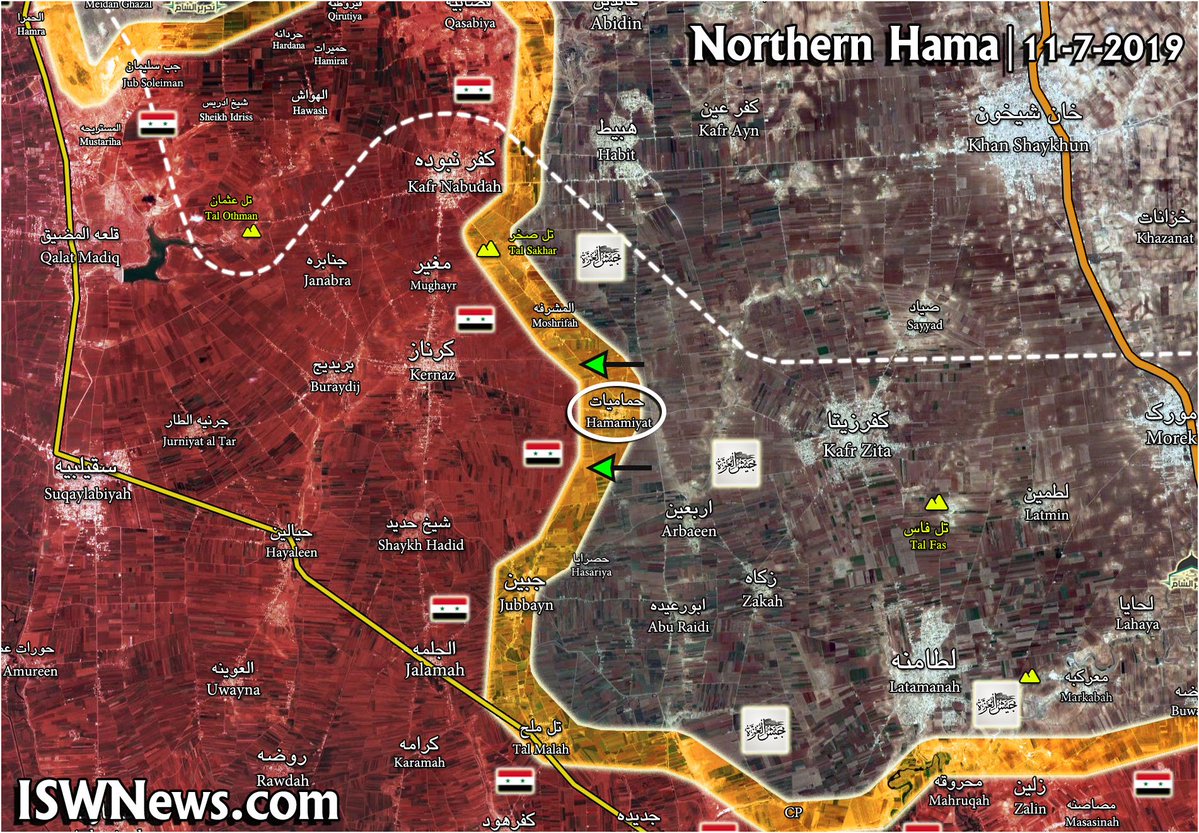 Χθες οι τρομοκράτες της HTS μετά από σφοδρές μάχες κατέλαβαν και το χωριό Al-Hamameyat στη Β Χάμα όπως και το ομώνυμο στρατηγικό ύψωμα που βλέπει σε Kernaz και Jalamah….Πολλοί από τους τρομοκράτες που έλαβαν μέρος σε αυτήν την επίθεση είναι τσετσενικής καταγωγής.