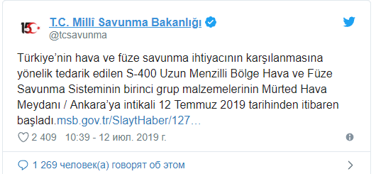 ” Άρχισε στο αεροδρόμιο Mürted/Άγκυρα, στις 12 Ιουλίου 2019 η παράδοση της πρώτης παρτίδας υλικών του συστήματος εναέριας και πυραυλικής άμυνας μεγάλου βεληνεκούς του S-400, το οποίο παρασχέθηκε για να ανταποκριθεί στις ανάγκες της εναέριας και πυραυλικής άμυνας της Τουρκίας” αναφέρει το ανακοινωθέν.