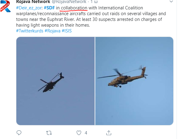 Aπό την πλευρά της κούρδικη πηγή αναφέρει πως οι SDF σε συνεργασία με την Διεθνής Συμμαχία αναγνωριστικά αεροπλάνα, ελικόπτερα έκαναν επιδρομές σε αρκετά χωριά κοντά στον Ευφράτη. Τουλάχιστον 30 ύποπτοι συνελήφθηκαν με την κατηγορία κατοχής ελαφρών όπλων στα σπίτια τους……