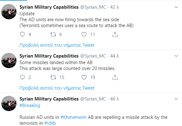 Για μεγάλη επίθεση κάνουν λόγο κάποιες πηγές που αναφέρουν πως πάνω από 20 πύραυλοι εκτοξεύθηκαν κατά της βάσης και ότι κάποιοι έπεσαν εντός της αεροπορικής βάσης. Τα αντιαεροπορικά της βάσης στρέφονται τώρα κατά στόχων πάνω από τη θάλασσα αφού οι τρομοκράτες κάποιες φορές χρησιμοποιούν αυτή τη τροχιά για να χτυπήσουν τη βάση. Η επίθεση προήλθε από τους τρομοκράτες του Ιντλίμπ. To shamfm αναφέρει ότι πιθανότατα η επίθεση προήλθε από drones.