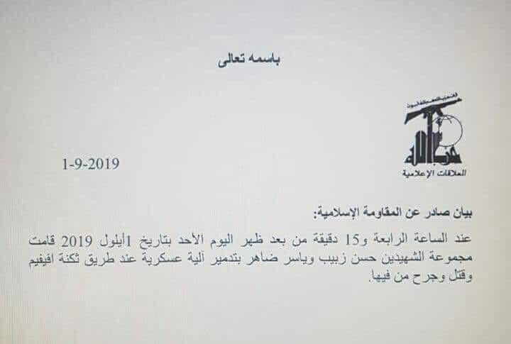 « Στις 16H15 (13H15 GMT), η μονάδα των ”μαρτύρων Hassan Zbib και Yasser Daher” (που σκοτώθηκαν σε ισραηλινό βομβαρδισμό στις 25/8 κατά της Συρίας) κατέστρεψε ένα στρατιωτικό όχημα στο δρόμο που οδηγεί στο στρατόπεδο στην Avivim »,ανέφερε η Hezbollah σε ανακοινωθέν.Και συνεχίζει : « οι στρατιώτες που επέβαιναν σκοτώθηκαν και τραυματίστηκαν ». Ο Benjamin Netanyahu, κάλεσε ΗΠΑ και Γαλλία να παρέμβουν για να θέσουν τέλος στις εντάσεις στα σύνορα του Λιβάνου. al manar