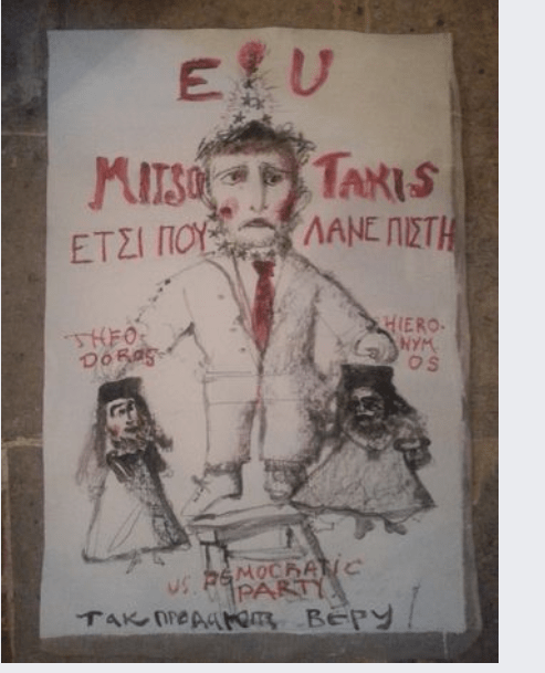 - Ο Μητσοτάκης ως θλιβερός αρλεκίνος της πολιτικής με ημίψηλο καπέλο με αστέρια της ΕΕ να στέφεται από τ΄αρχικά Ε.U και οι μαριονέτες της μυστικής ελληνικής διπλωματίας Θεόδωρος και Ιερώνυμος τον περιστοιχίζουν σε αφίσα Ρώσων διαδηλωτών έξω από την Ελληνική Πρεσβεία Μόσχας….Πολλά ρωσικά μέσα μεταξύ αυτών και το interfax αναφέρουν: μια σειρά από πικετοφορίες διαμαρτυρίας κατά των ενεργειών των Ελλήνων ιεραρχών που αναγνώρισαν την μη κανονική Ορθόδοξη Εκκλησία της Ουκρανίας (OCU) και «της ελληνικής κυβέρνησης που τους χειραγωγεί», πραγματοποιήθηκαν μπροστά από την Ελληνική Πρεσβεία στη Μόσχα τη Δευτέρα.