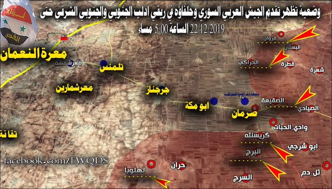 Πύραυλοι κρουζ Kalibr εκτοξεύθηκαν από ρωσικά πολεμικά πλοία από το λιμάνι της Ταρτούς στις θέσεις της HTS και ”αντιπολίτευσης” υποστηριζόμενης από Τουρκία στο Idlib. Την ίδια στιγμή οι τρομοκράτες, αντάρτες τρέπονται σε φυγή.Ο συριακός στρατός είναι τώρα σε Jarjanaz και Hish στο Ν Ιντλίμπ και συνεχίζει να προελαύνει για ν΄αποφύγει τα VBIED και IED,τα tanks προχωρούν έξω από το οδικό δίκτυο progressent hors des routes avec les engins de déminage en tête, ce qui ralentit la progression.