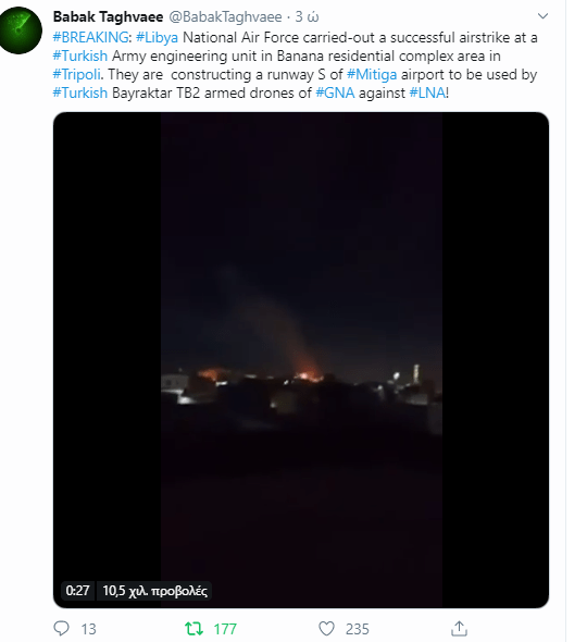 Ο LNA βομβάρδισε αεροπορικώς τη μονάδα μηχανικού του τουρκικού στρατού στον οικισμό Banana στην Τρίπολη. Κατασκευάζει 1 διάδρομο S στο αεροδρόμιο Mitiga για χρήση από τουρκικά drones Bayraktar TB2 του GNA εναντίον του LNA..Χτύπησαν και αποθήκη πυρομαχικών..