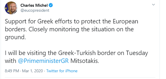 Πριν από λίγο βράδυ Κυριακής ο Βέλγος Πρωθυπουργός και Πρόεδρος Ευρωπαϊκού Συμβουλίου Charles Michel δήλωσε την υποστήριξή του στις ελληνικές προσπάθειες για φύλαξη ευρωπαϊκών συνόρων κι ανακοίνωσε πως θα μεταβεί μαζί με τον Έλληνα Πρωθυπουργό την Τρίτη στα ελληνοτουρκικά σύνορα.