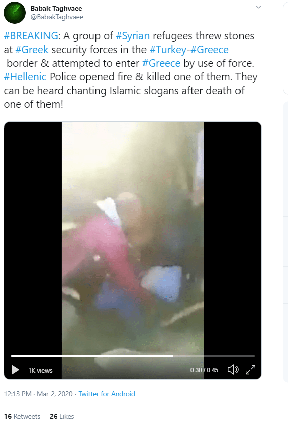 Πριν από λίγο ξένη πηγή αναφέρει πως καθώς μια ομάδα ”προσφύγων” λιθοβολούσε τους άνδρες των ελληνικών αρχών στον Έβρο και επιχειρούσε να διέλθει βιαίως η Ελληνική αστυνομία άνοιξε πυρ και σκότωσε έναν από αυτούς. Ακούγονται στο βίντεο ισλαμικά συνθήματα…Για χρήση όπλων με αληθινές σφαίρες εκ μέρους ελληνικών αρχών κάνουν λόγο τώρα τούρκικες πηγές. Η ελληνική Πολιτεία οφείλει να επιβεβαιώσει αυτές τις πληροφορίες…Ο λογαριασμός που διακινεί την πληροφορία είναι αμερικανικών συμφερόντων κι εμφανίζεται ως αντικαθεστωτικός του Ιράν…..
