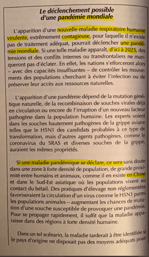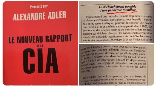 Αυτά εμπεριέχονται σ΄ένα μικρό βιβλίο με κόκκινο εξώφυλλο, προγενέστερο της διάλεξης του Bill Gates, βάση του οποίου η CIA είχε ”προβλέψει” τα επερχόμενα. « Le nouveau rapport de la CIA : comment sera le monde en 2025 ? »“Η νέα έκθεση της CIA: πώς θα είναι ο κόσμος το 2025( ο αυριανός κόσμος);” του οποίου η γαλλική έκδοση δημοσιεύθηκε από τον εκδ. οίκο Robert Laffont το 2009, είναι η τέταρτη έκδοση μιας έκθεσης των αμερικάνικων υπηρεσιών πληροφοριών, που προσπαθούν τακτικά να προβλέψουν το μέλλον του κόσμου σ’ έναν ορίζοντα δεκαπέντε έως είκοσι ετών, επισημαίνοντας την εμφάνιση παραγόντων που ενδέχεται να προκαλέσουν συγκρούσεις και εντάσεις. Σ’ ένα ένθετο με τίτλο “Η πιθανή εκδήλωση μιας παγκόσμιας πανδημίας”, οι εμπειρογνώμονες της CIA περιγράφουν ένα σενάριο πολύ κοντά στην κρίση Covid-19, καθώς φαντάζονται “την εμφάνιση μιας νέας μολυσματικής, εξαιρετικά μεταδοτικής ανθρώπινης αναπνευστικής νόσου “.