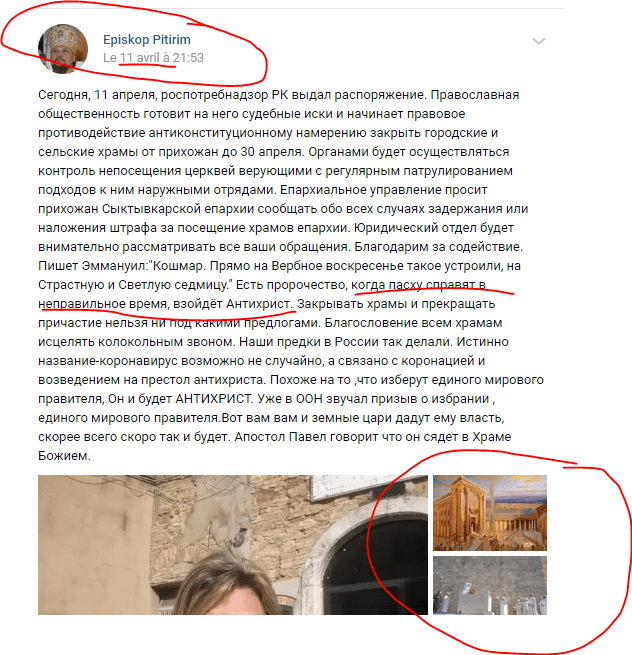 Ο Αρχιεπίσκοπος Πιτιρίμ του Syktyvkar και Komi-Zyryansky στη Ρωσία (στη Δημοκρατία Komi) διαφοροποιείται έντονα από πολιτική εξουσία και Πατριαρχείο Μόσχας για σφράγισμα ναών και δίνει διαστάσεις αποκαλυπτικές στην όλη υπόθεση.Μεταξύ άλλων γράφει στην επίσημη σελίδα του στο VK: «Σήμερα, 11 Απριλίου, η Ομοσπονδιακή Υπηρεσία επιτήρησης και προστασίας των δικαιωμάτων των καταναλωτών και της ευζωίας του ατόμου (Rospotrebnadzor) της Δημοκρατίας του Καζακστάν εξέδωσε ένα διάταγμα. Η Ορθόδοξη κοινότητα ετοιμάζει αγωγές εναντίον του και ξεκινά νομική αντίθεση στην αντισυνταγματική πρόθεση να κλείσουν οι εκκλησίες της πόλης και της υπαίθρου για τους ενορίτες μέχρι τις 30 Απριλίου (δηλ. απαγόρευση Πάσχα).*Οι αρχές θα παρακολουθούν την επιβεβλημένη αποχή πιστών από εκκλησίες με τακτικές περιπολίες από εξωτερικές μονάδες.