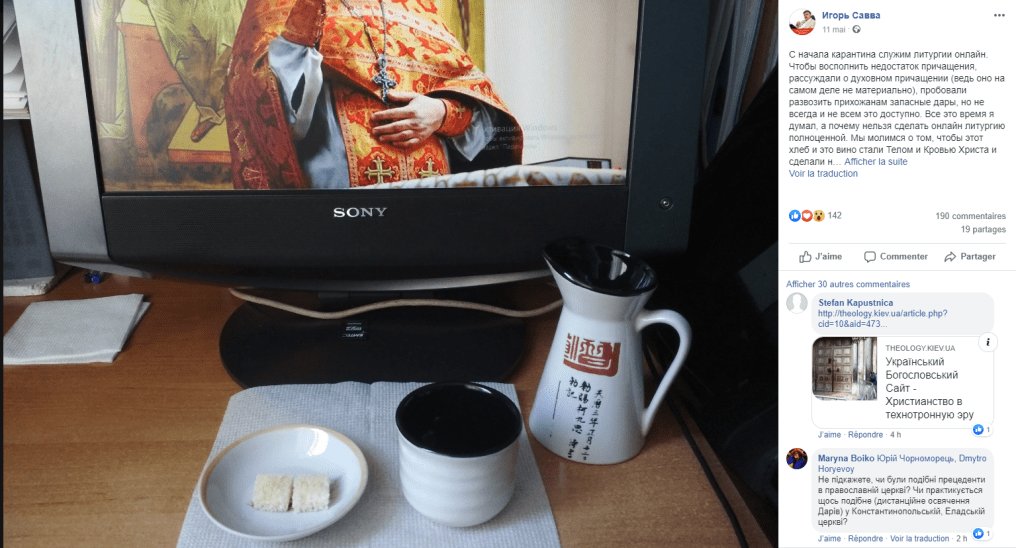 «Με την έναρξη του lockdown τελούμε Θεία Λειτουργία on-line…Δεόμαστε όπως αυτός ο άρτος και αυτός ο οίνος να γίνουν Σώμα και Αίμα Χριστού… Είναι δυνατόν να μην ισχύει αυτή η προσευχή εξ αποστάσεως; Μήπως τα ερτζιανά κύματα (WiFi) ή και η χρήση ηλεκτρονικών συσκευών αποτελούν εμπόδιο για την πορεία μας προς την ένωσή μας με τον Χριστό και με το ζωοποιό Σώμα και Αίμα;» – γράφει στο facebook ο αεριτζής Ίγκορ.