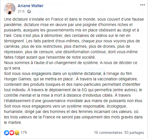 Mια δικτατορία εγκαθίσταται στη Γαλλία και σ΄όλον τον κόσμο υπό την κάλυψη μιας fake πανδημίας, δικτατορία που τίθεται σ΄εφαρμογή από μια χούφτα πλούσιους και δυνατούς στους οποίους οι κυβερνήσεις υπακούουν στην παραμικρή κίνηση του δαχτύλου και στο κλείσιμο του ματιού. Αυτό δεν είναι πλέον προς απόδειξη , εκατοντάδες vidéos στο net το μαρτυρούν.Τα γεγονότα μιλούν από μόνα τους.Καθημερινά βλέπουμε περισσότερες κάμερες περισσότερους περιοριστικούς νόμους περισσότερα όπλα περισσότερα drones περισσότερη καταπίεση περισσότερη λογοκρισία μια συνεχή παραπληροφόρηση που εσείς είστε το αντικείμενο όσο και όλη η κοινωνία μας.Είμαστε στην αυγή μιας αλλαγής συστήματος.Σ΄εμάς εναπόκειται ν’ αποφασίσουμε τι θα είναι.