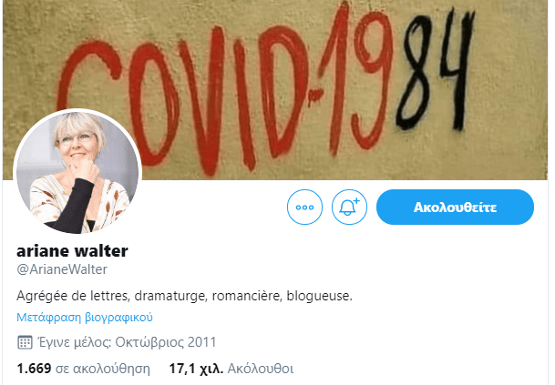 ( Η Ariane Walter Καθηγήτρια φιλόλογος,δραματουργός,μυθιστοριογράφος,blogueuse έγραψε στο fb της στις 13/5/20. Κατοικεί στην Αθήνα.)