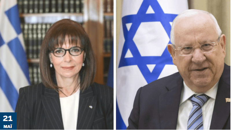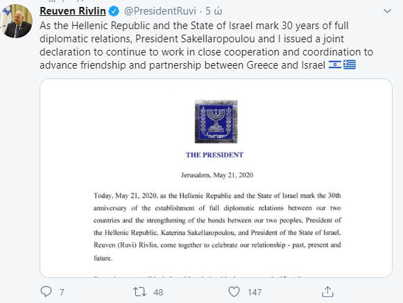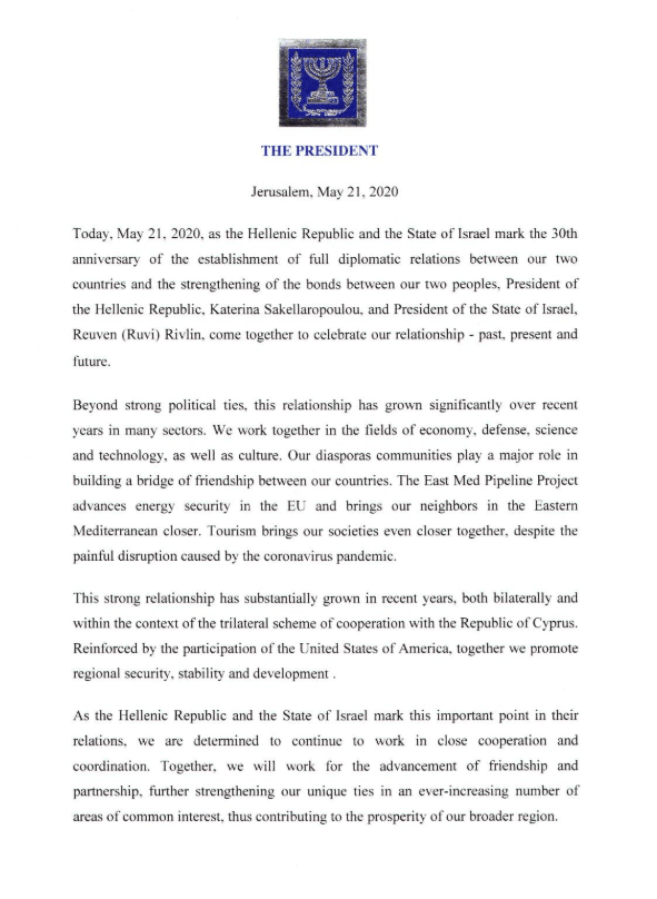Σήμερα, 21η Μαΐου 2020, καθώς η Ελληνική Δημοκρατία και το Κράτος του Ισραήλ συμπληρώνουν 30 χρόνια εγκαθίδρυσης πλήρων διπλωματικών σχέσεων μεταξύ των δύο χωρών μας και ενδυνάμωσης των δεσμών μεταξύ των δύο λαών μας, η Πρόεδρος της Ελληνικής Δημοκρατίας Κατερίνα Σακελλαροπούλου και ο Πρόεδρος του Κράτους του Ισραήλ Reuven (Ruvi) Rivlin εορτάζουν από κοινού το παρελθόν, παρόν και μέλλον των διμερών μας σχέσεων.