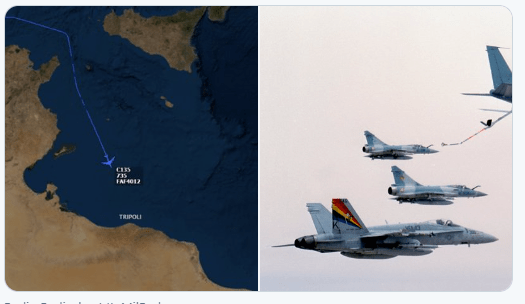 Σήμερα το πρωί παρακολουθήσαμε από την Istres AB, στη νότια Γαλλία, μέχρι το Στενό της Σικελίας, ένα «Stratotanker» της Boeing C-135FR της Γαλλικής Πολεμικής Αεροπορίας (735). Το αεροσκάφος ακολούθησε τη συνήθη διαδρομή που χρησιμοποίησαν τα γαλλικά tanker κατά την πτήση προς τη Λιβύη.