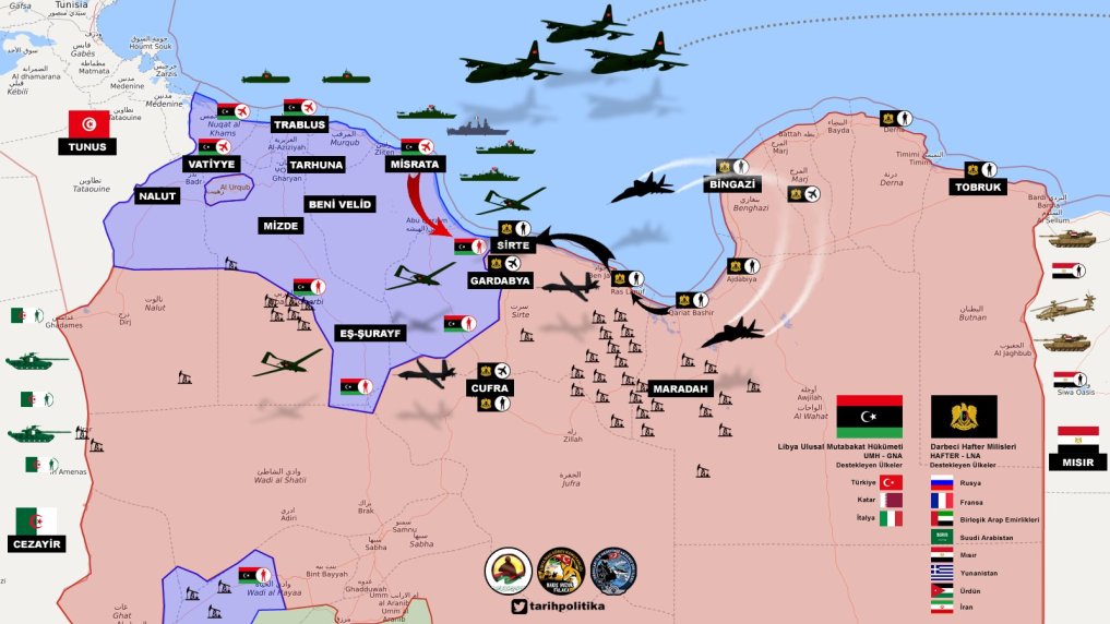 Oι στρατιωτικές επιχειρήσεις συνεχίζονται εκατέρωθεν στη Λιβύη καθώς η Τουρκία διαμηνύει προς πάσα κατεύθυνση πως απορρίπτει την πρόταση εκεχειρίας Καΐρου.Η Τουρκία δεν συνθηκολογεί θέλει πόλεμο η κατάσταση φθάνει στ΄άκρα. O πόλεμος είναι μπροστά αυτοί που βιάζονται να προεξοφλήσουν το τέλος του Χαφτάρ ίσως αιφνιδιαστούν από τις εξελίξεις…Άλλωστε και σήμερα παραμένει κυρίαρχος στα 3/4 της χώρας..Σφυροκόπημα από την αεροπορία του LNA κατά θέσεων GNA στη Μισράτα.Κίνηση αντιπερισπασμού και επιβράδυνσης στην επιχείρηση Σύρτη που αποτόλμησε Τουρκικός στρατός και συμμαχικές του πολιτοφυλακές. Η αεροπορία του LNA βομβάρδισε τις τελευταίες ώρες στους άξονες ανατολικά της πόλης Μισράτα. Τα μαχητικά αεροσκάφη της Πολεμικής του Αεροπορίας συνεχίζουν τις εντατικές αεροπορικές αποστολές τους στοχεύοντας έναν αριθμό θέσεων των ομάδων al-Wefaq που υποστηρίζονται από Τούρκους μισθοφόρους, με αποτέλεσμα: