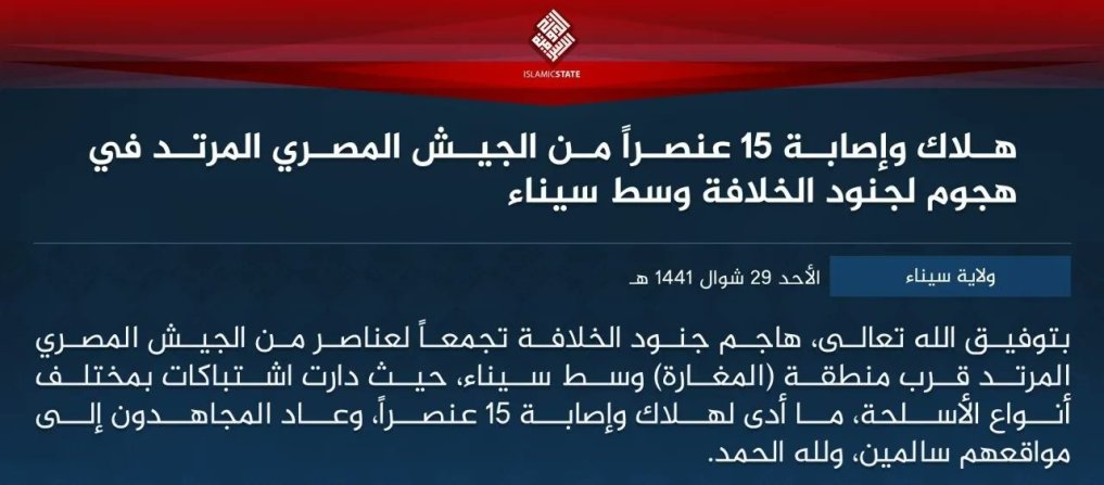Ανακοινώνεται από ISIS ότι χτύπησε θέση αιγυπτιακού στρατού χθες και σκότωσε 15 στρατιώτες κοντά στο Jabel al-Maghara στο Κεντρικό Σινά.Φαίνεται πως οι τζιχαντιστές που εργαλειοποιούνται ως ετεροκίνητοι από ξένες δυνάμεις δεν αφήνουν το Σίσι απερίσπαστο με λιβυκό…Από την άλλη ο ισλαμιστικός εξτρεμισμός στο Σινά δίνει λαβή στο Σίσι για στρατιωτική επέμβαση στη Λιβύη επικαλούμενος την τρομοκρατία και την ασφάλεια χώρας του…