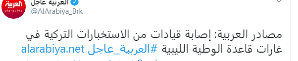 Το alhadath αναφέρει πως υψηλόβαθμοι Τούρκοι στρατιωτικοί και μέλη των μυστικών υπηρεσιών Τουρκίας τραυματίστηκαν επίσης στην επίθεση…Επικαλούμενο αραβικές πηγές το alarabiya αναφέρει πως Τούρκοι διοικητές των μυστικών πληροφοριών (ΜΙΤ) τραυματίστηκαν στις αεροπορικές επιδρομές στη βάση Al-Watiya..