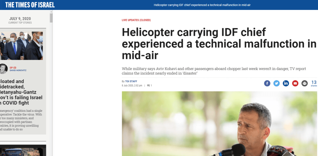Το ελικόπτερο που μετέφερε τον επικεφαλής της IDF παρουσίασε τεχνική δυσλειτουργία στον αέρα αναφέρει το timesofisrael.Και προσθέτει ενώ ο στρατός λέει ότι ο και οι άλλοι επιβάτες στο ελικόπτερο την περασμένη εβδομάδα δεν διέτρεξαν κίνδυνο, η τηλεόραση ισχυρίζεται ότι το συμβάν παραλίγο να καταλήξει σε «καταστροφή»