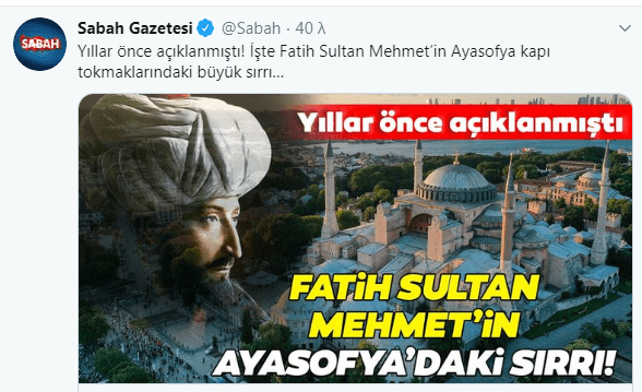 “Η προσευχή στο τζαμί Ayasofya θα γίνει για α΄φορά με την προσευχή της Παρασκευής 24 Ιούλη.” “Μη όντας πλέον μουσείο η επί χρήμασι είσοδος στο τζαμί Ayasofya θα καταργηθεί.”