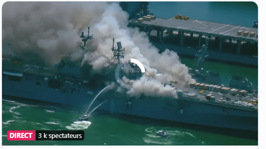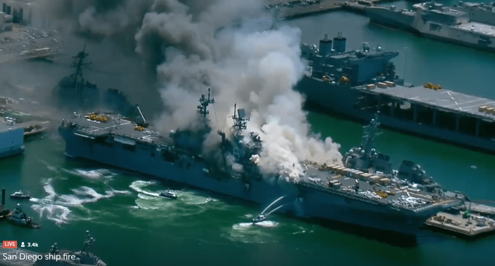 Οι πυροσβέστες συνεχίζουν να επιχειρούν για να σβήσουν την εκτεταμένη πυρκαγιά στο αμφίβιο πολεμικό πλοίο των ΗΠΑ USS Bonhomme Richard στη ναυτική βάση του San Diego. Μεταφέρεται πως υπάρχουν πολλοί τραυματίες ίσως και νεκροί.…Σημειώθηκαν εκρήξεις.Σύμφωνα με την Πυροσβεστική Υπηρεσία του Σαν Ντιέγκο, αρκετοί ναύτες νοσηλεύονται τραυματίες και τοπικά μέσα ανέφεραν εκρήξεις από την πυρκαγιά.Θυμίζει Περλ Χάρμπορ πολύ περισσότερο που πριν φτάσει στο San Diego το 2018, το φλεγόμενο πλοίο Bonhomme Richard ήταν για 6 χρόνια στην Ιαπωνία συμμετέχοντας στην U.S. Forward Deployed Naval Force…….Οι ειδήσεις πλέον λογοκρίνονται λόγω του ότι αποτελούν ευαίσθητα δεδομένα του στρατού των ΗΠΑ.Ωστόσο το CNN μεταδίδει πολλοί τραυματίες μετά από έκρηξη στο πλοίο…Περίπου 200 ναύτες ήταν στο πλοίο. Είναι στη φάση εκκένωσης…Έγιναν 3 συναγερμοί φωτιάς. Το πλήρωμα πολέμησε με τις φλόγες μεταφέρεται γι αυτό και οι τραυματίες….