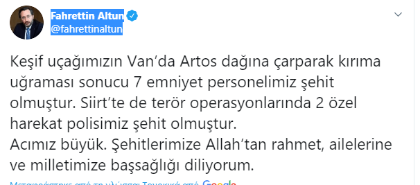 Ο Φαχρεττίν Άλτουν ο Διευθυντής της Επικοινωνίας της Τούρκικης Προεδρίας παραδέχεται την είδηση για συντριβή του αεροσκάφους και ότι σκοτώθηκαν 7 άνδρες που ανήκουν στην Τούρκικη Ασφάλεια. Ο ίδιος αναφέρει ότι σκοτώθηκαν στη Σύρτη άλλοι 2 Τούρκοι ειδικών επιχειρήσεων κι εκφράζει τα συλλυπητήριά του…