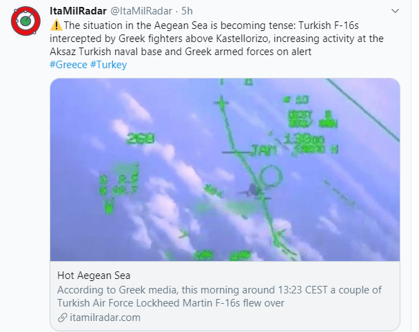 Οι προαναγγελθείσεις «σεισμικές έρευνες» είναι εντός της ελληνικής υφαλοκρηπίδας.«Δεν θα δεχθούμε την άδεια κανενός», ανέφερε ο Ερντογάν για τη NAVTEX ανοιχτά του Καστελόριζου.Παρατηρήθηκε αυξημένη δραστηριότητα στη ναυτική βάση του Aksaz, με 15 πολεμικά πλοία να πραγματοποιούν απόπλου από εκεί .19 ή 15 πλοία του πολεμικού ναυτικού Τουρκίας είναι στη Μεσόγειο.Πηγές του υπουργείου Εθνικής Άμυνας αναφέρουν ότι το 85% του ελληνικού στόλου βρίσκεται στο Αιγαίο από την περιοχή της Σμύρνης και νοτιότερα και παρακολουθεί στενά τις κινήσεις του τουρκικού στόλου.6 μαχητικά αεροσκάφη F-16 τούρκικα πετούν στην περιοχή.Κάνουν χαμηλές υπερπτήσεις πάνω από τα νησιά Ρω,Μεγίστη,Στρογγύλη. Αερομαχίες για 3 ώρες με αναχαιτίσεις πάνω από το Καστελόριζο. Το τούρκικο ωκεανογραφικό «Oruç Reis» είναι εν πλω προς την επίμαχη ζώνη…
