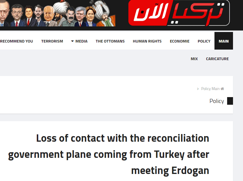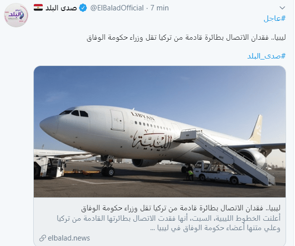 Kαι η αιγυπτιακή εφημερίδα ElWatan με 13.000.000 ακόλουθους επικαλούμενη το “Libya 24” website αναφέρει πως χάθηκε η επαφή με το αεροπλάνο που μετέφερε υπουργούς του Sarraj από την Τουρκία στη Λιβύη.