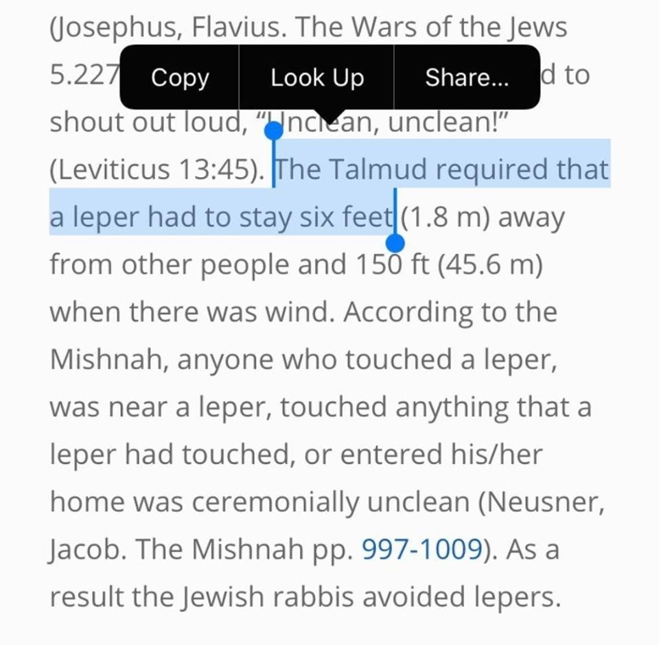 ” Το Talmud απαιτούσε ο λεπρός να είναι στα 6 πόδια (1,8 m) από τα άλλα πρόσωπα και στα 150 πόδια (45,6 m) όταν πνέει άνεμος . Σύμφωνα με το Mishna,όλοι όσοι άγγιξαν το λεπρό ( σσ.τα ίδια και για νεκρό) βρέθηκαν δίπλα του ή άγγιξαν κάτι που ακούμπησε ή μπήκαν σπίτι του ήταν τελετουργικά ακάθαρτοι …” Το Mishnah ή Mishna είναι η πρώτη μεγάλη γραπτή συλλογή των Ιουδαιστικών προφορικών παραδόσεων που είναι γνωστές ως Ταλμούδ.