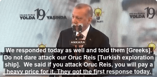 O Erdogan έκανε μια δήλωση που χρήζει απάντησης από ελληνικής πλευράς:”είπαμε να μην επιτεθείτε στο Oruç Reis, αν επιτεθείτε θα πληρώσετε βαρύ τίμημα και σήμερα πήραν την πρώτη απάντηση.”(aa) Τι εννοεί ο ποιητής; Αναφέρεται στο θερμό επεισόδιο με φρεγάτα Λήμνο σε κάτι άλλο; Ο Ερντογάν μίλησε τηλεφωνικά με Μέρκελ σήμερα και με τον Πρόεδρο του Ευρωπαϊκού Συμβουλίου το Βέλγο Charles Michel…ενώ ο Τσαβούσογλου είχε αντίστοιχα επικοινωνία με πολλούς ομολόγους του Ευρωπαίους πάντα για την Αν. Μεσόγειο.. όλη αυτή κινητικότητα δεν είναι καλή τους ανακοινώνουν κάτι;;;