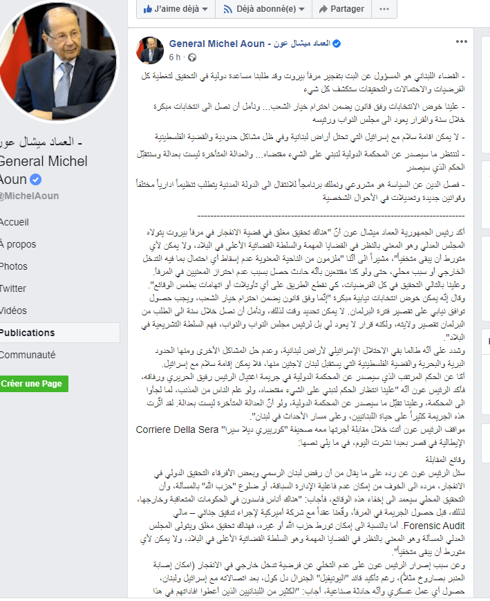 Ο Πρόεδρος της δημοκρατίας Michel Αoun επιβεβαίωσε ότι υπάρχει μια έρευνα για την υπόθεση έκρηξης στο λιμάνι της Βηρυτού, η οποία είναι υπεύθυνη για την εξέταση σημαντικών υποθέσεων και της ανώτατης δικαστικής αρχής της χώρας, και κανείς άλλος δεν εμπλέκεται.