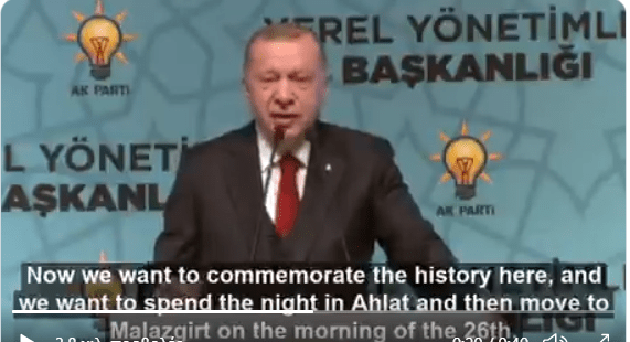 Η επιθυμία μας είναι ν΄αναβιώσουμε την ιστορία μας με το Νέο Προεδρικό μας συγκρότημα χτισμένο στο Ahlat. Γιατί το alParslan στρατοπεύδευσε και διανυκτεύρευσε εδώ στο Ahlat και ξεκίνησε εφόρμησε για το Μαντζικέρτ* την μάχη από εδώ…Τώρα θέλουμε να εορτάσουμε την ιστορία εδώ κι θέλουμε να ξοδέψουμε τη νύχτα στο Ahlat και τότε να κινήσουμε για το Ματζικέρτ το πρωί της 26ης….