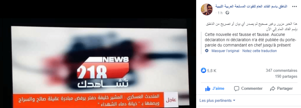 Καμιά δήλωση δεν δημοσιεύθηκε σήμερα από τον εκπρόσωπο τύπου του LNA ως όφειλε για τη συμφωνία που ανακοινώθηκε από GNA και Πρόεδρο Κοινοβουλίου Τομπρούκ Aguila Saleh αναφέρει ο ίδιος ο εκπρόσωπος στο λογαριασμό του..