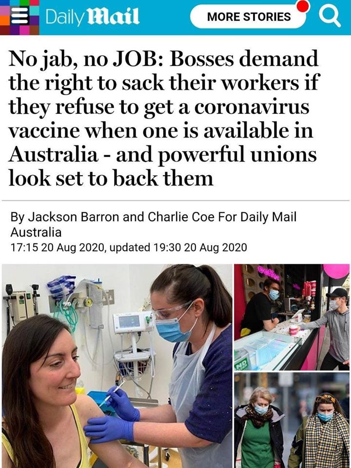 Στην Αυστραλία σύμφωνα με ρεπορτάζ της Daily Mail τ΄αφεντικά ζητούν να έχουν το δικαίωμα ν΄απολύουν τους εργαζόμενους τους αν αυτοί αρνούνται να κάνουν το εμβόλιο κατά του covid19 όταν αυτό θα είναι διαθέσιμο στην Αυστραλία , και τα ισχυρά συνδικάτα φαίνεται ότι είναι έτοιμα να υποστηρίξουν αυτήν την απαίτηση..όχι εμβόλιο όχι δουλειά λοιπόν….No jab, no JOB