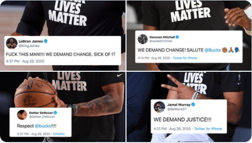 O Donald Trump κατηγόρησε την Πέμπτη το NBA ότι έγινε μια πολιτική οργάνωση μετά το boycottage πολλών matchs του basketball ως αντίδραση στην υπόθεση του μαύρου Jacob Blake που πυροβολήθηκε 7 φορές στην πλάτη από αστυνομικούς παρουσία των 3 παιδιών του απρόκλητα και παρουσιάζει παράλυση 80%.