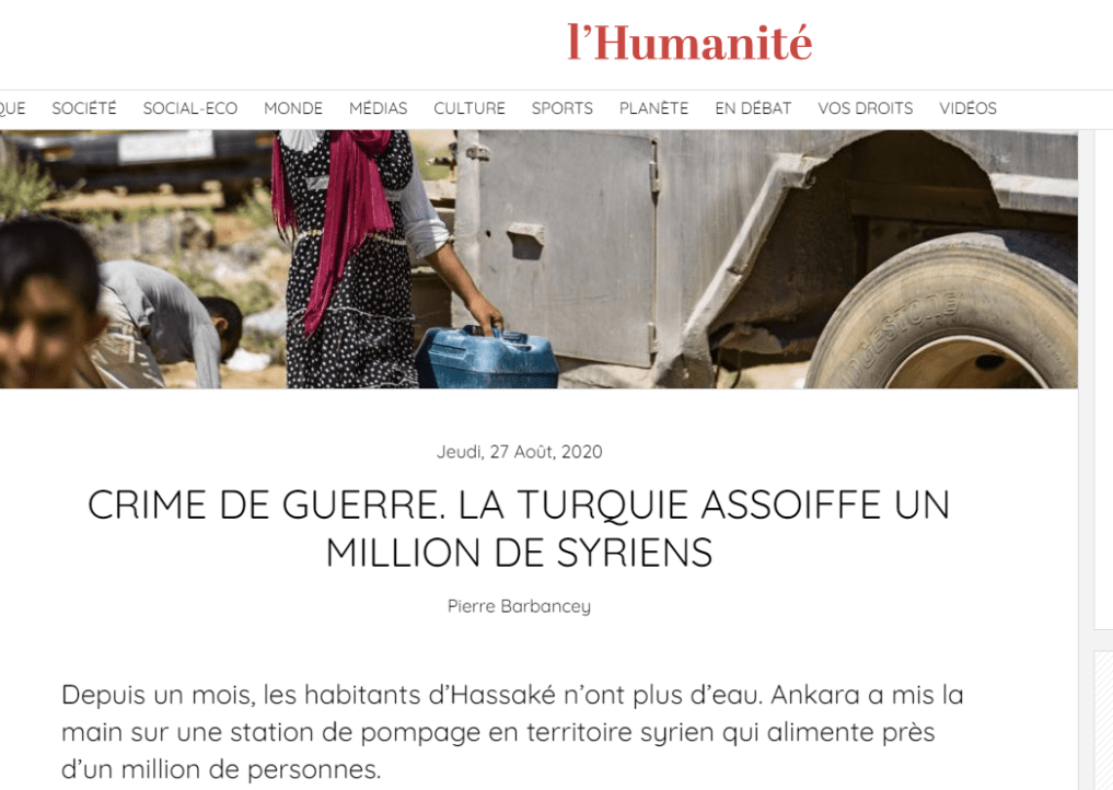 Εδώ κι 1 μήνα οι κάτοικοι της Hassaké δεν έχουν πια νερό.Η Άγκυρα έβαλε χέρι σ΄ένα αντλιοστάσιο επί συριακού εδάφους που τροφοδοτεί περίπου 1.000.000 άτομα. Η τούρκικη εισβολή στο βορρά της Συρίας που άρχισε στις 9 του Οκτώβρη 2019 είχε την κωδική ονομασία « πηγή της ειρήνης ».Από τότε για τους κατοίκους δεν υπάρχουν πια πηγές ούτε ειρήνη.Εδώ και πολλές εβδομάδες τώρα η πόλη της Hassaké και τα τριγύρω χωριά στερούνται πρόσβαση στο πόσιμο νερό λόγω της διακοπής από τις τούρκικες δυνάμεις κατοχής του υδραγωγείου Allouk, που βρίσκεται στην κατεχόμενη ζώνη του Serêkaniyê (Ras al-Ain). Στο πλαίσιο μιας ιδιαίτερης ζέστης (το θερμόμετρο ανεβαίνει ως τους 45 °C) και μιας επανεκκίνησης της πανδημίας Covid-19, διακυβεύεται άμεσα η ζωή εκατοντάδων χιλιάδων ατόμων…