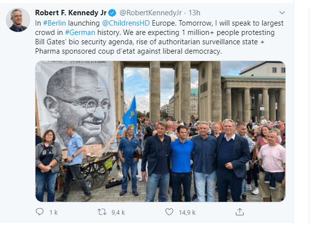 O Robert F. Kennedy Jr ανακοίνωσε πως θα δώσει δυναμικό παρόν σήμερα στην γιγαντιαία κινητοποίηση στο Βερολίνο κατά της” βιολογικής ασφάλειας του Bill Gates, την άνοδο της αυταρχικής επιτήρησης και του πραξικοπήματος χρηματοδοτούμενου από την Pharma κατά της δημοκρατίας.”