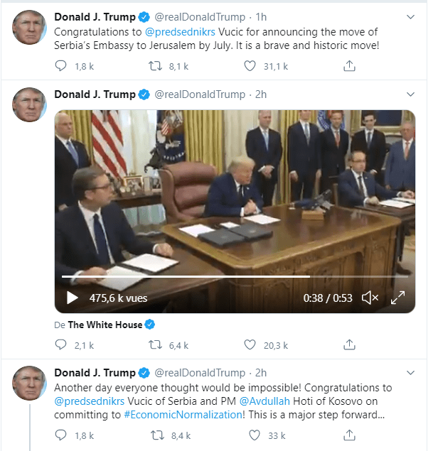 Σε αυτό το ντελίριο εξελίξεων ο Vucic δήλωσε πως από τον Ιούλιο η Πρεσβεία της χώρας του πάει στην Ιερουσαλήμ. Ο Vucic της Σερβίας και ο πρωθυπουργός Avdullah Hoti του Κοσσυφοπεδίου δεσμεύθηκαν σε εξομάλυνση οικονομικών σχέσεων των χωρών τους πρώτο βήμα για αναγνώριση από Σερβία του κρατιδίου προτεκτοράτου του Κοσσυφοπεδίου..