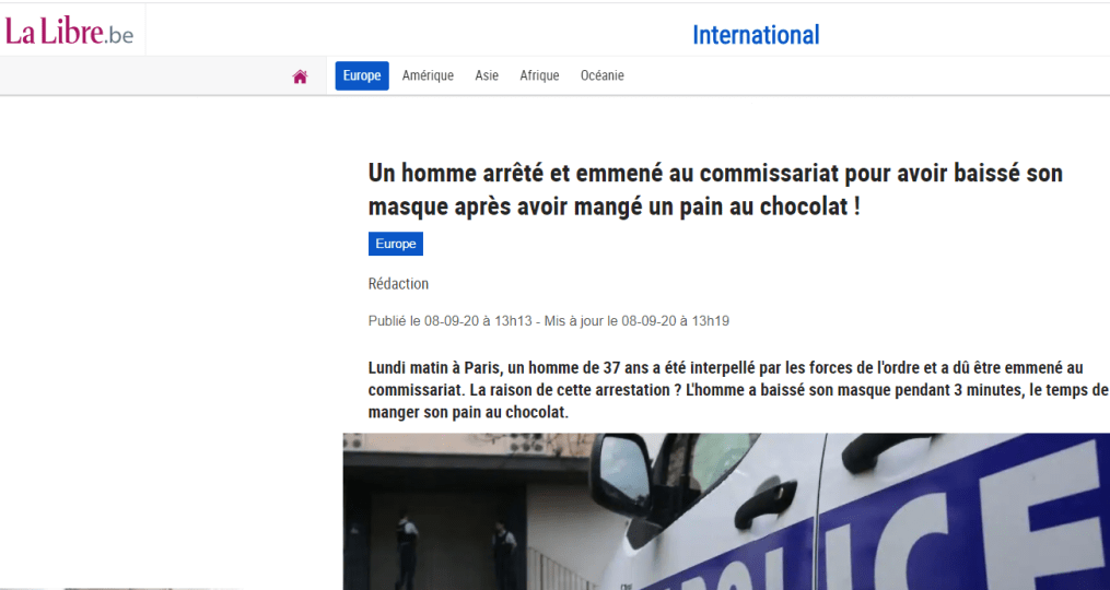 Η κατάντια της Γαλλίας των Φώτων….ένας Γάλλος 37 ετών συνελήφθηκε και οδηγήθηκε στο αστυνομικό τμήμα μόνο και μόνο γιατί έβγαλε τη μάσκα του για να φάει ένα γλυκό σοκολάτα . Διασταυρώθηκε μ΄έναν αστυνομικό βγαίνοντας από το φούρνο.Αυτό είναι κωμικοτραγικό δήλωσε ο άνθρωπος αναφέρει το BFM. ”Μασουλούσα ακόμη είχα χαμηλώσει τη μάσκα .Όταν είδα ότι αυτός θα με συνελάμβανε του είπα ”είστε τρελός” κι μ΄απάντησε «Δεν είμαι τρελός», εξηγεί ο David στο BFM TV.Aυτό συνέβη στο κέντρο του Παρισιού στις 10.15 το πρωί περίπου αναφέρει η lalibre.Ο άνθρωπος κατέβασε τη μάσκα μόνο για 3′.