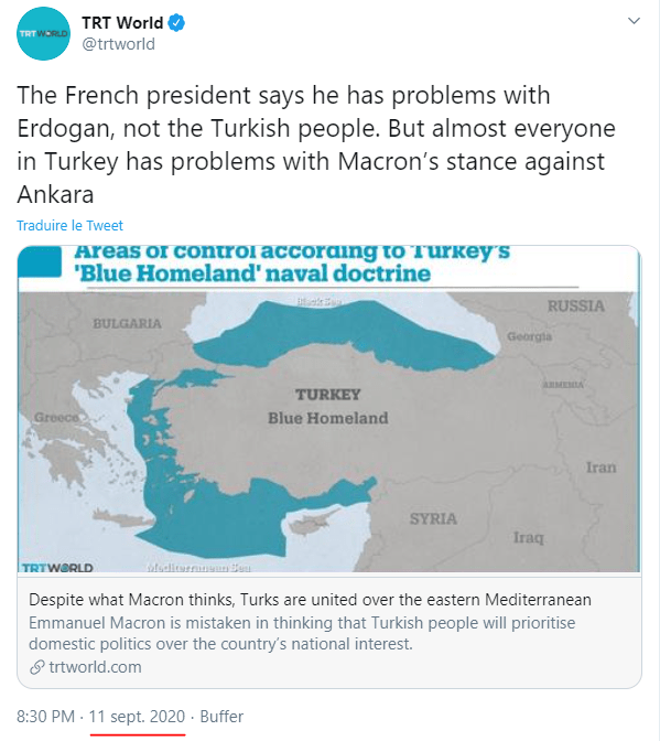 To Σάββατο 12/9/20 το κρατικό τούρκικο TRT δημοσιεύει χάρτη που όπως αναφέρει δείχνει τις περιοχές υπό τουρκικό έλεγχο σύμφωνα με το δόγμα της Γαλάζιας Πατρίδας και συμπεριλαμβάνει σε αυτές Ρόδο, Μυτιλήνη, Χίος, Σάμος, Κως κ.λ.π