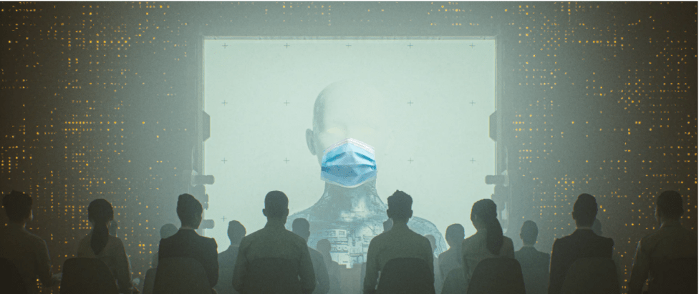 Ο Γερμανός συγγραφέας Ernst Jünger προέβλεψε την πανταχού παρούσα μάσκα προσώπου για την επιβολή κομφορμισμού-συμβατότητας και ομοιομορφίας σε μια μελλοντική δυστοπική κοινωνία σ’ ένα μυθιστόρημα με τίτλο The Worker που δημοσιεύθηκε πριν από σχεδόν 90 χρόνια..