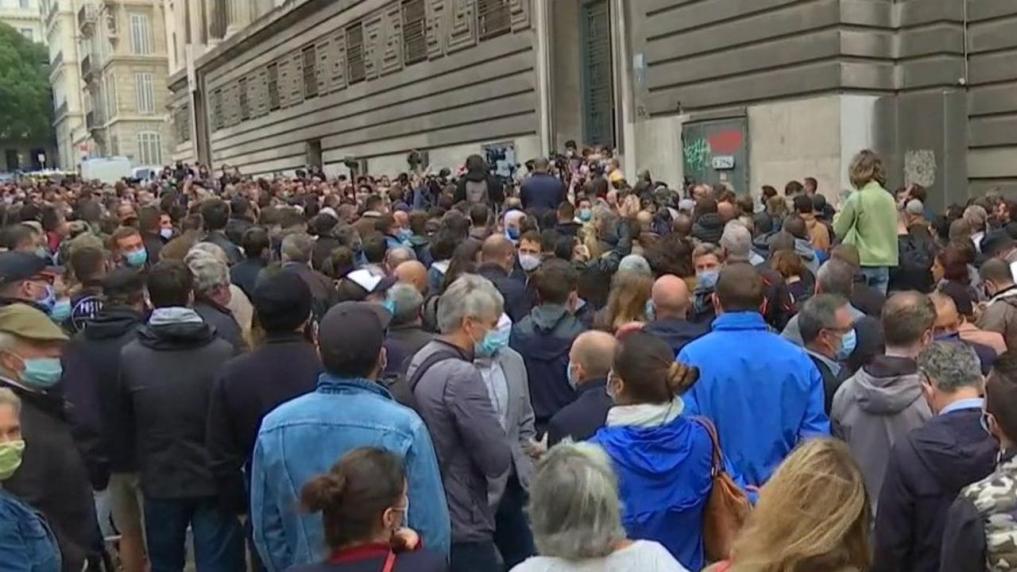 Μιλώντας με μεγάφωνο μπροστά από το πλήθος, το επικεφαλής της Ένωσης Union des métiers et des Industries de l’hôtellerie des Bouches-du-Rhône Bernard Marty επανέλαβε τη σθεναρή αντίθεση της Ένωσής του στους ανακοινωθέντες περιορισμούς, ενώ το πλήθος αποδοκίμασε στο όνομα του υπουργού Υγείας Olivier Véran όταν το εξέφρασε. «Και πού είναι; Αφήστε τον να έρθει εδώ!» Είπε ένας διαδηλωτής στο lci.
