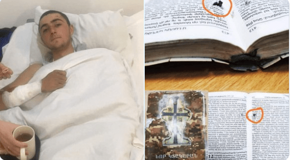 Σύμφωνα με αναφορές, ένας νεαρός δεν διευκρινίζεται ακόμη αν ήταν στρατιώτης βρισκόταν μέσα στην εκκλησία στην πόλη Shushi στο Αρτσάχ όταν βομβαρδίστηκε από την αζεροτούρκικη συμμαχία. Ο νεαρός Αρμένιος σώθηκε πραγματικά ως εκ θαύματος όταν η Αγία Γραφή του σταμάτησε ,εξοστράκισε το θραύσμα κι απέτρεψε να τον σκοτώσει.Η Βίβλος του έσωσε τη ζωή στο Ναό του Αγίου Σωτήρα..H Βίβλος εμφανώς έχει δεχθεί το θραύσμα…