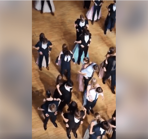 Στην Τσεχία εξτρεμιστές του covid19 εκπαιδευτικοί καθηγητές αποδεικνύουν την απόλυτη τρέλα τους, αναγκάζοντας τους μαθητές να φορούν μάσκες και να χορεύουν ένα βαλς στο σχολείο, όπου τα ζευγάρια ήταν υποχρεωμένα να μην είναι αντικρυστά πρόσωπο με πρόσωπο αλλά να χορεύουν πλάτη με πλάτη….Και ως μετανεωτερικό βέλο οι ντάμες φέρουν υγειονομική μάσκα όπως και οι καβαλιέροι….