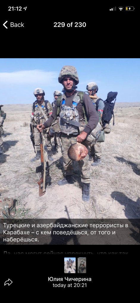 Unfortunately, the Azerbaijani aggression started to incorporate brutal and totally barbaric actions as the Armenian Resistance keeps strong despite the Azero/Turkish pressure.After the bombing of residential areas in Stepankert, of religious historical sites in Sushi of hospitals and of schools..After the killing of Armenian prisoners of war enveloped in the Armenian flag as a symbol of humiliation.Today , appeared the signs of the total hate and of the unprecedented criminal methods of the Azerbaijani Army, as Armenian soldiers were brutally martyred by beheading..